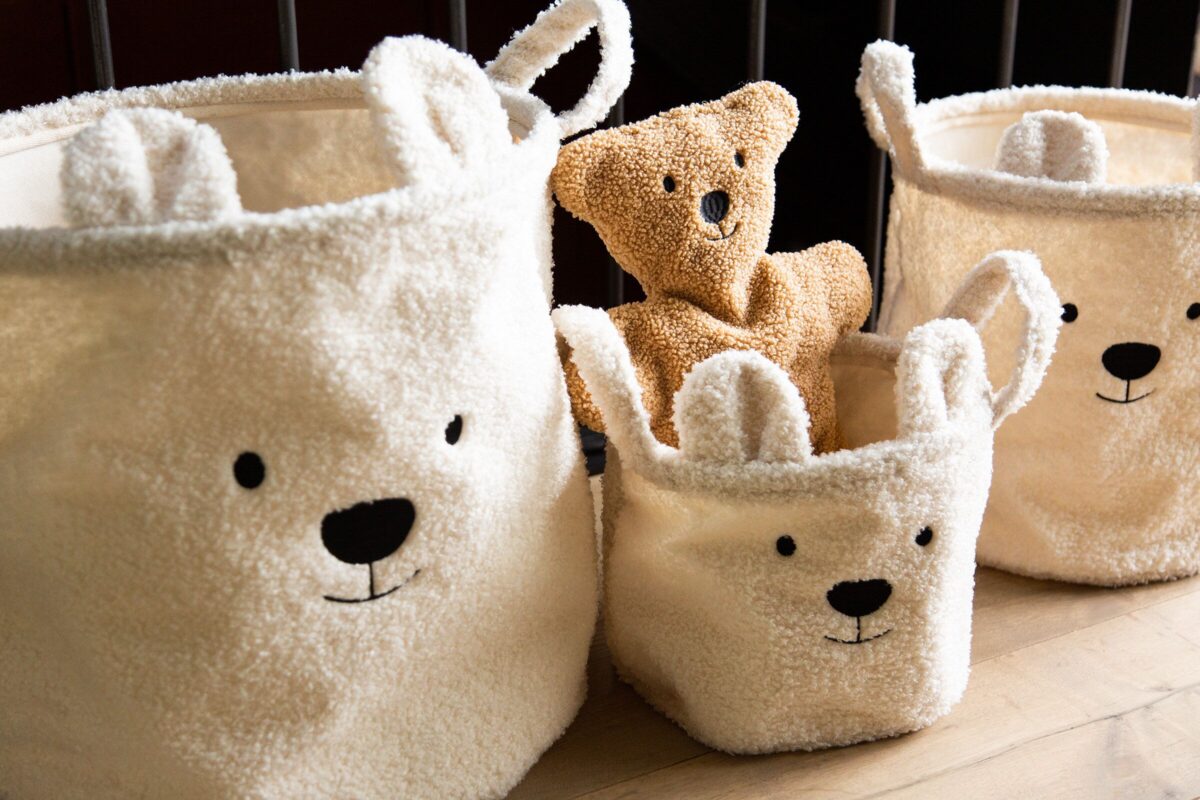 This cute set 2 Teddy Pleated Baskets are very suitable for storing various things such as toys, clothes, and other things. The storage baskets are the perfect size to use as a toy bag or laundry basket. In this way, you can store your child’s belongings in a convenient and beautiful way. The soft plush fabric and cute bear ears immediately add a cheerful touch. The storage baskets have a convenient inner lining that is easy to clean with a damp cloth. Warning: This baskets are not a toy. Use only as a decoration or storage baskets.