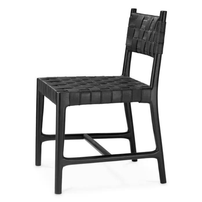 Sumptuous black leather seats interlace seamlessly, creating a sophisticated woven design atop sleek, classic black legs. This chair embodies modern luxury, offering a timeless aesthetic that enhances any setting with its bold, stylish presence.
