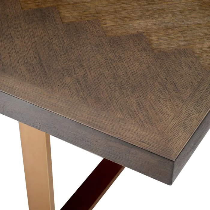 The brown oak veneer tabletop features a beautiful herringbone pattern. It rests on a metal base with brushed brass finish to ensure it effortly blends in a variety of décors.