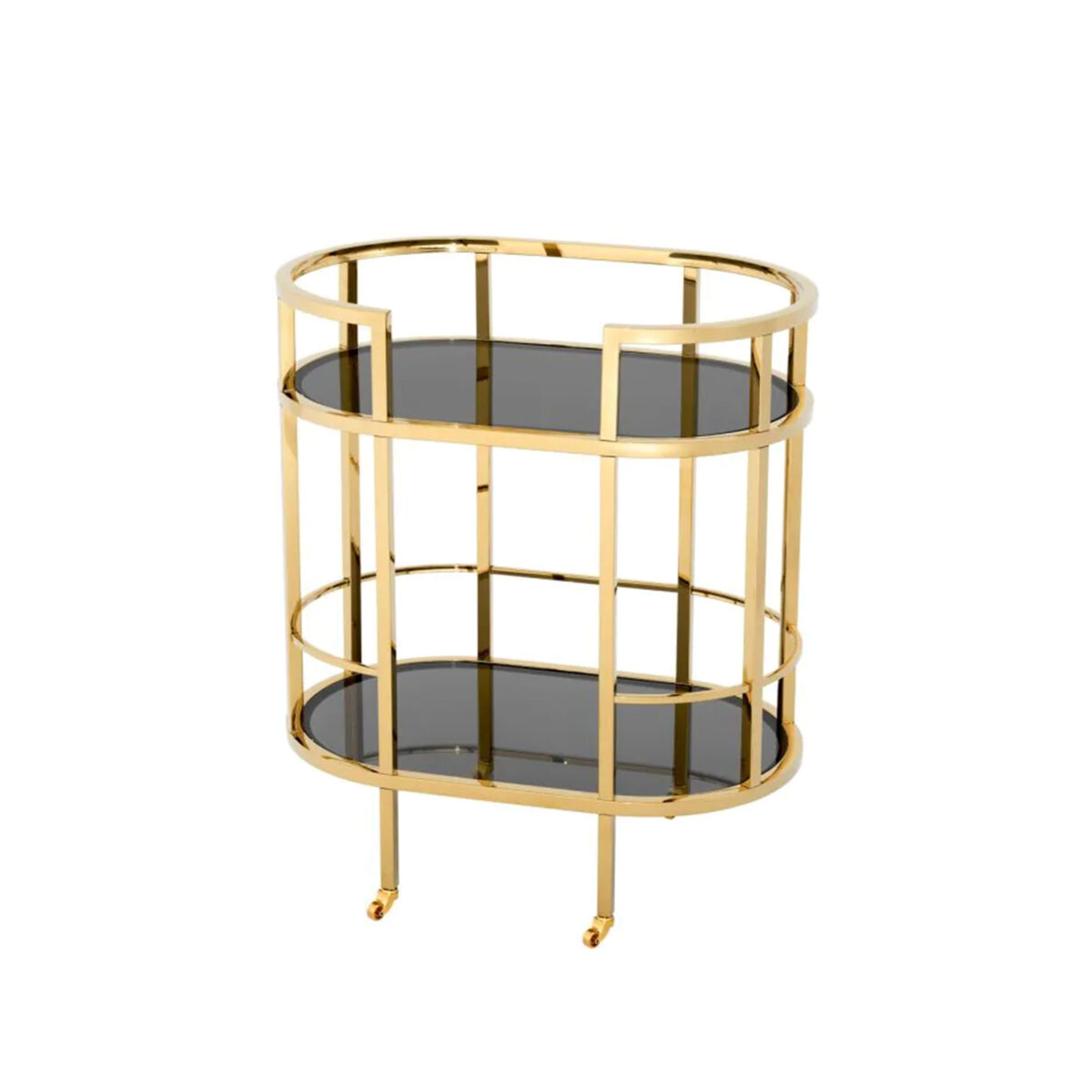 Four decorative castor wheels give this fabulous side table the appealing vintage look of a traditional bar cart for serving cocktails. It has an elegant curved gold finished frame that holds two levels of dark smoked glass.