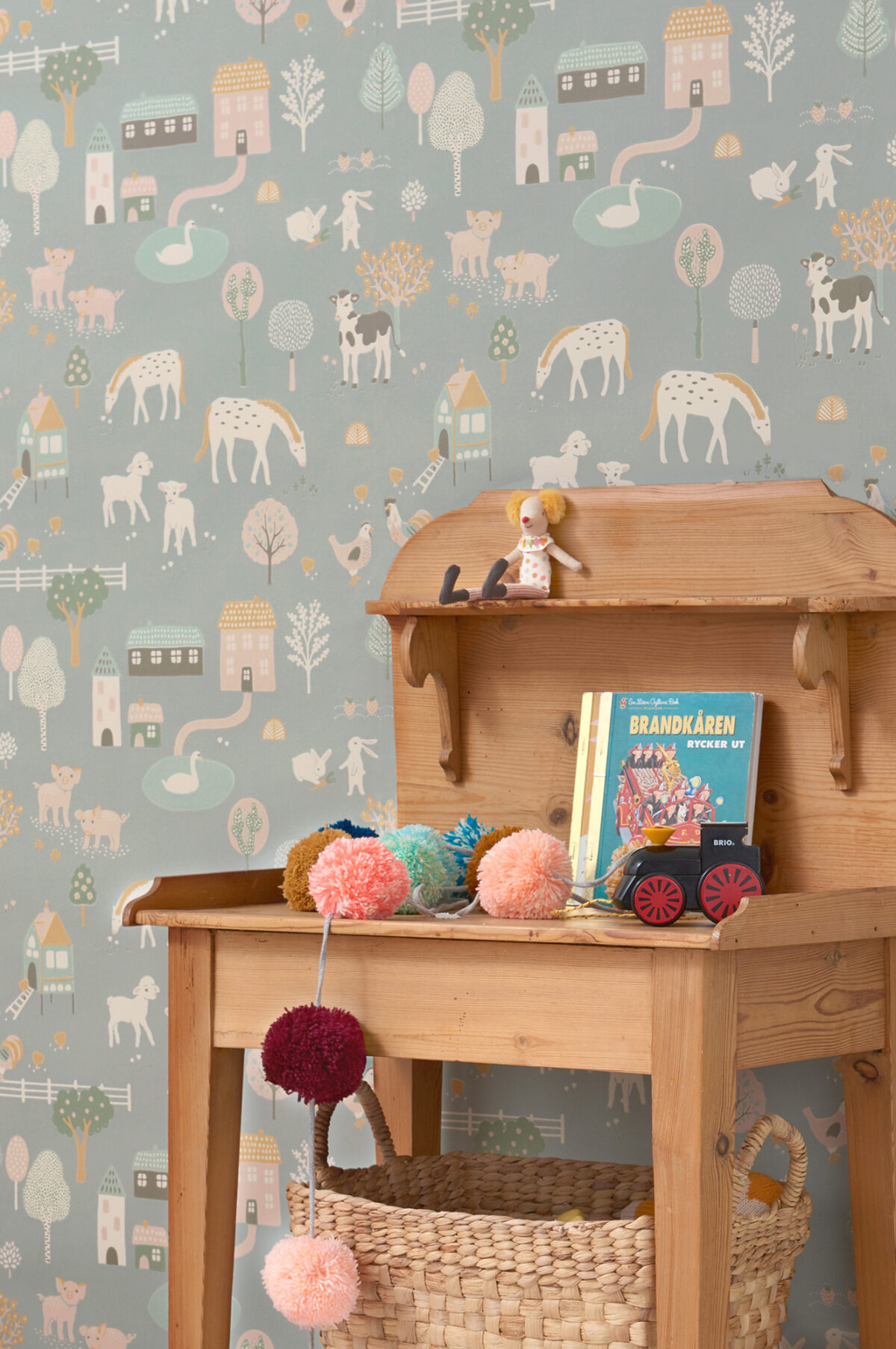 Swedish brand Majvillan brings the cheerful spirit of the countryside to life with this beautifully crafted, surface-print non-woven wallpaper. Playful horses, curious cows, piglets, chickens, and graceful swans come together in a vibrant, child-friendly palette.