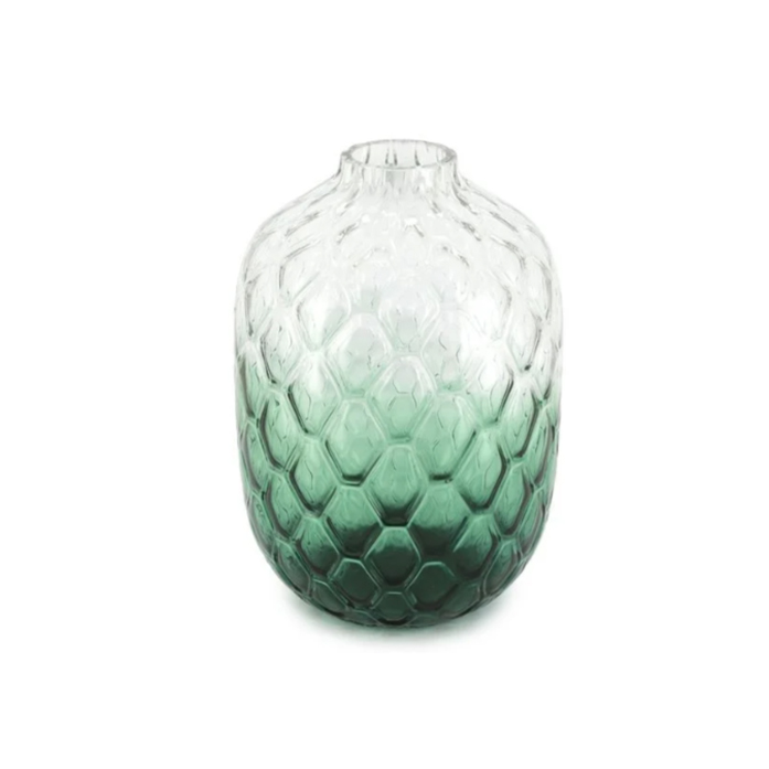 Изящно декорированная стеклянная ваза с зелеными инкрустациями.