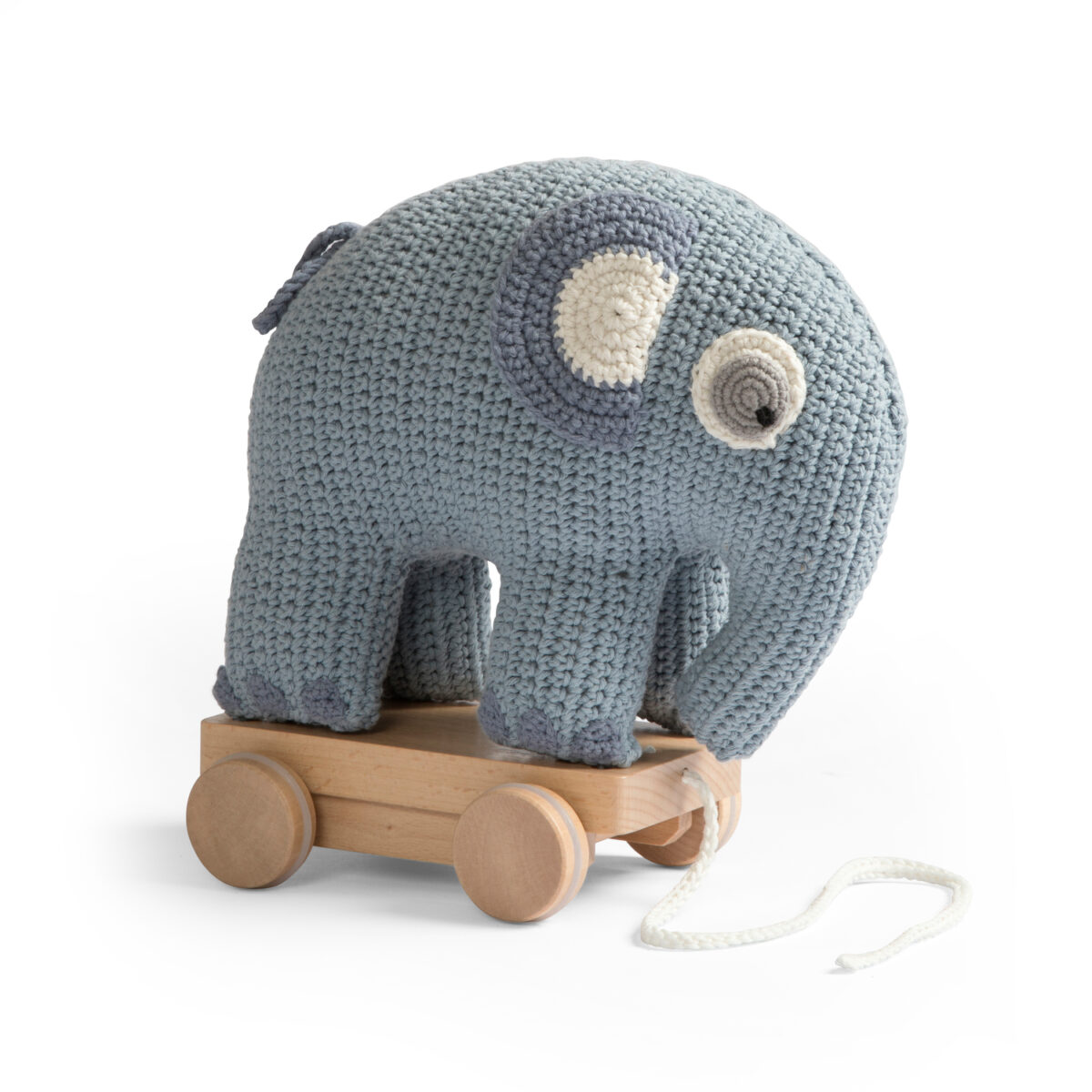 The elephant has two-toned ears and big, cute eyes. The elephant is mounted on a natural coloured, varnished wooden board with four wheels. On each wheel is a clear silicone ring that ensures the protection of delicate floors when the elephant takes a walk. The ring can be removed if necessary. A small cotton drawstring makes it possible to pull the elephant behind you.