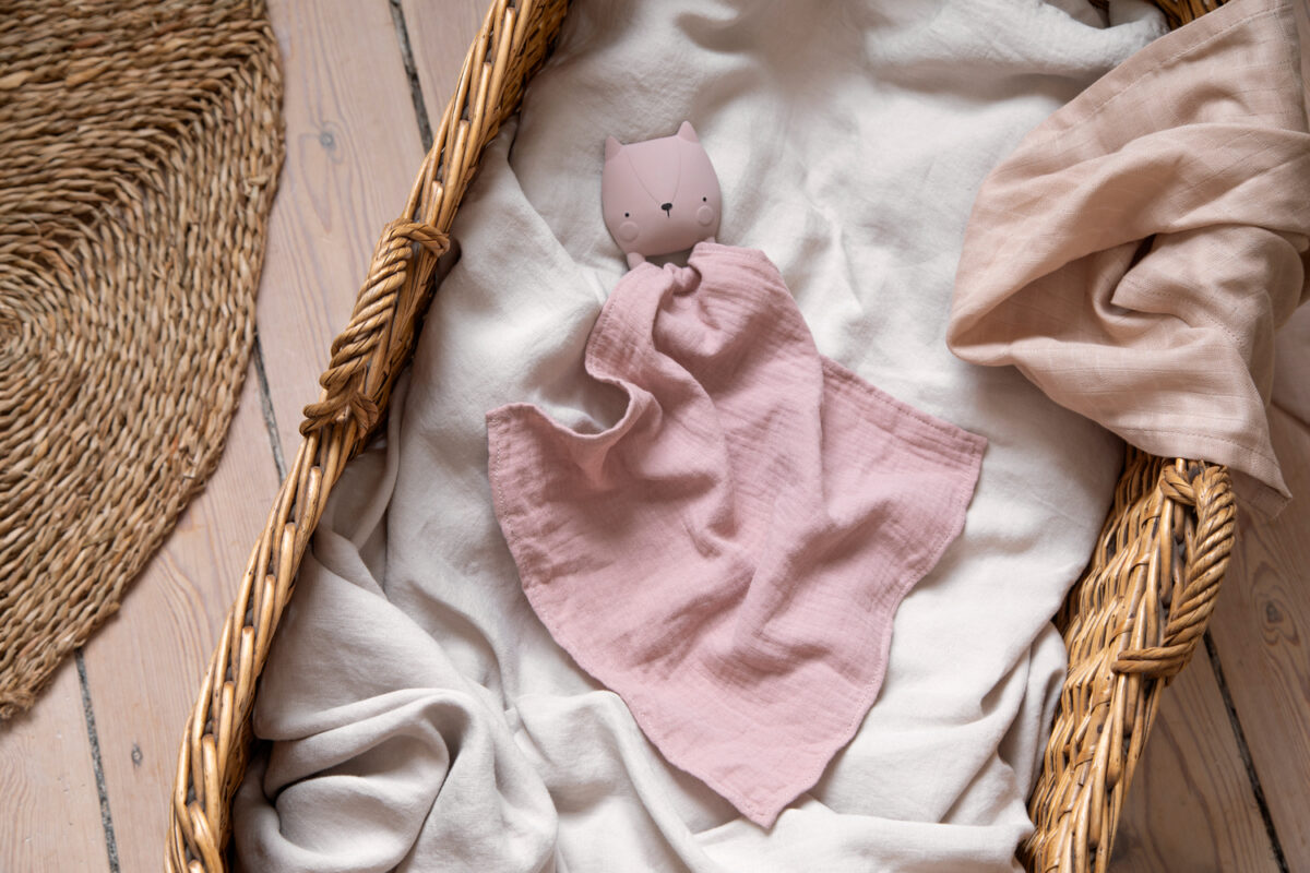 The comforter is made of certified organic cotton, while the teething ring is made of latex – also known as natural rubber because the latex is extracted from the Hevea tree. The teething ring is part of the Sebra Woodland collection.